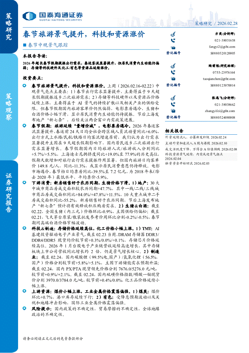 国泰海通证券-春节中观景气跟踪:春节旅游景气提升,科技和资源涨价-260228