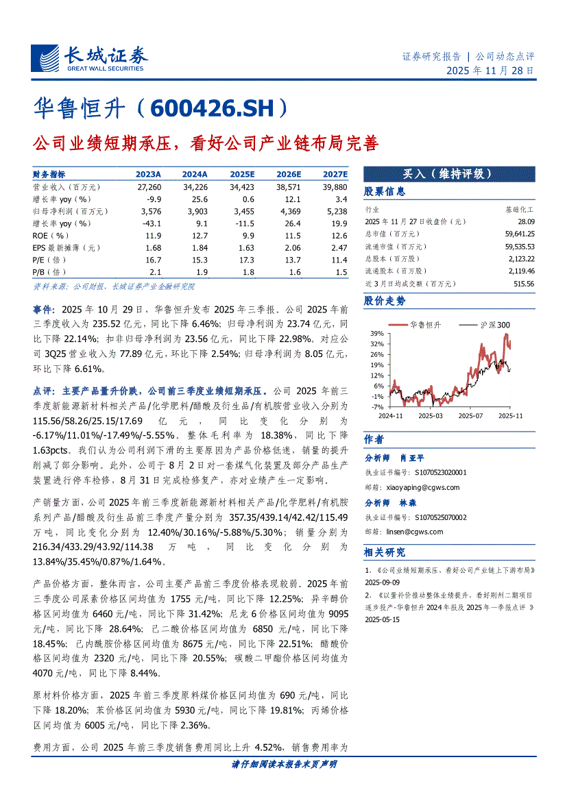 华鲁恒升:长城证券-华鲁恒升-600426-公司业绩短期承压,看好公司产业链布局完善-251128