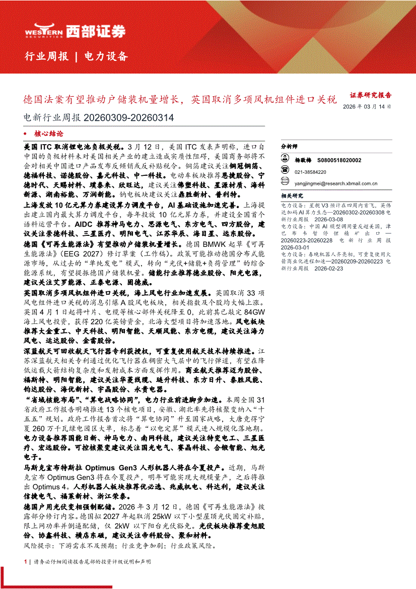 电新行业:西部证券-电新行业周报:德国法案有望推动户储装机量增长,英国取消多项风机组件进口关税-260314