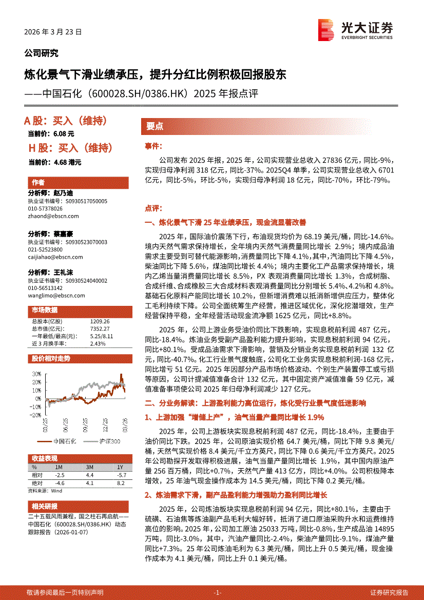 中国石化:光大证券-中国石化-600028-2025年报点评:炼化景气下滑业绩承压,提升分红比例积极回报股东-260323