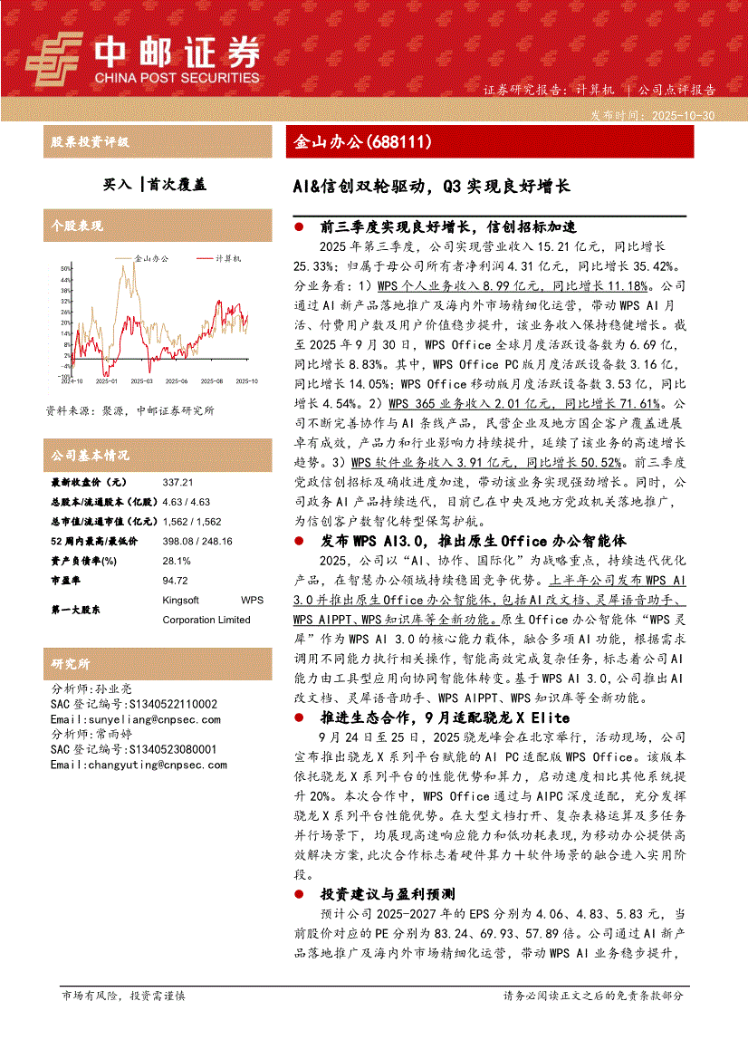 金山办公:中邮证券-金山办公-688111-AI&信创双轮驱动,Q3实现良好增长-251030
