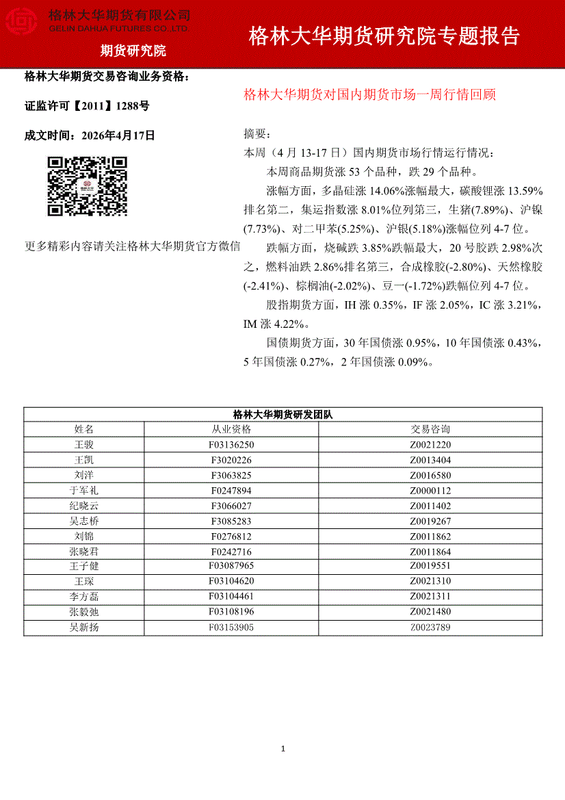 格林大华期货-格林大华期货对国内期货市场一周行情回顾-260417