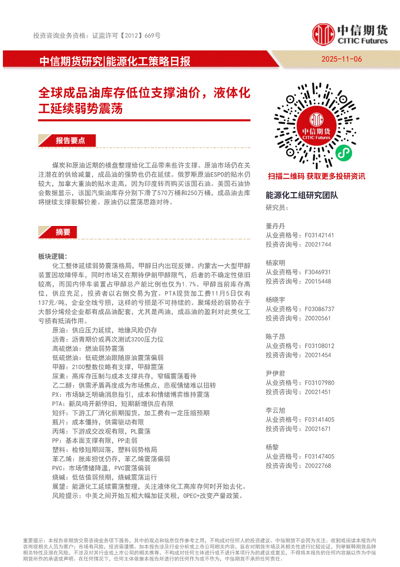 中信期货-能源化工策略日报:全球成品油库存低位支撑油价,液体化工延续弱势震荡-251106