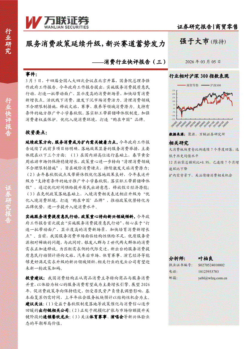 消费行业:万联证券-消费行业快评报告(三):服务消费政策延续升级,新兴赛道蓄势发力-260305