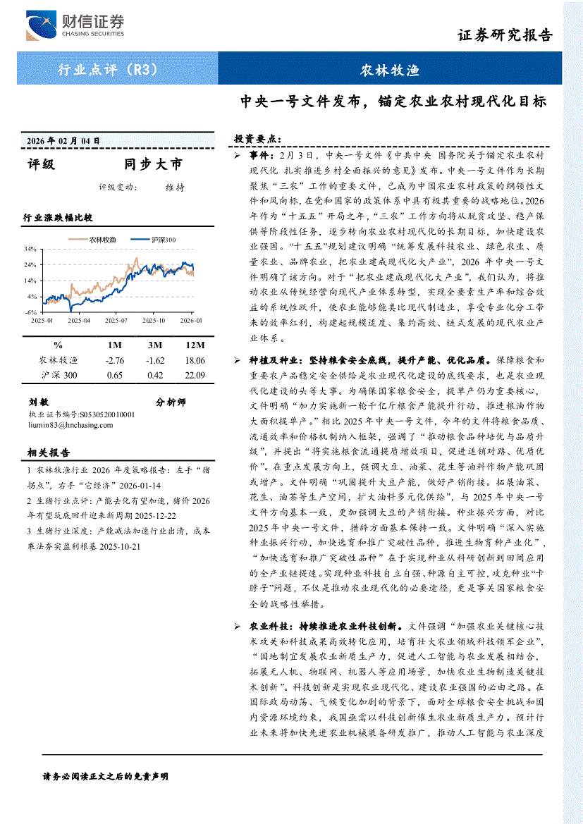 农林牧渔行业:财信证券-农林牧渔行业:中央一号文件发布,锚定农业农村现代化目标-260204