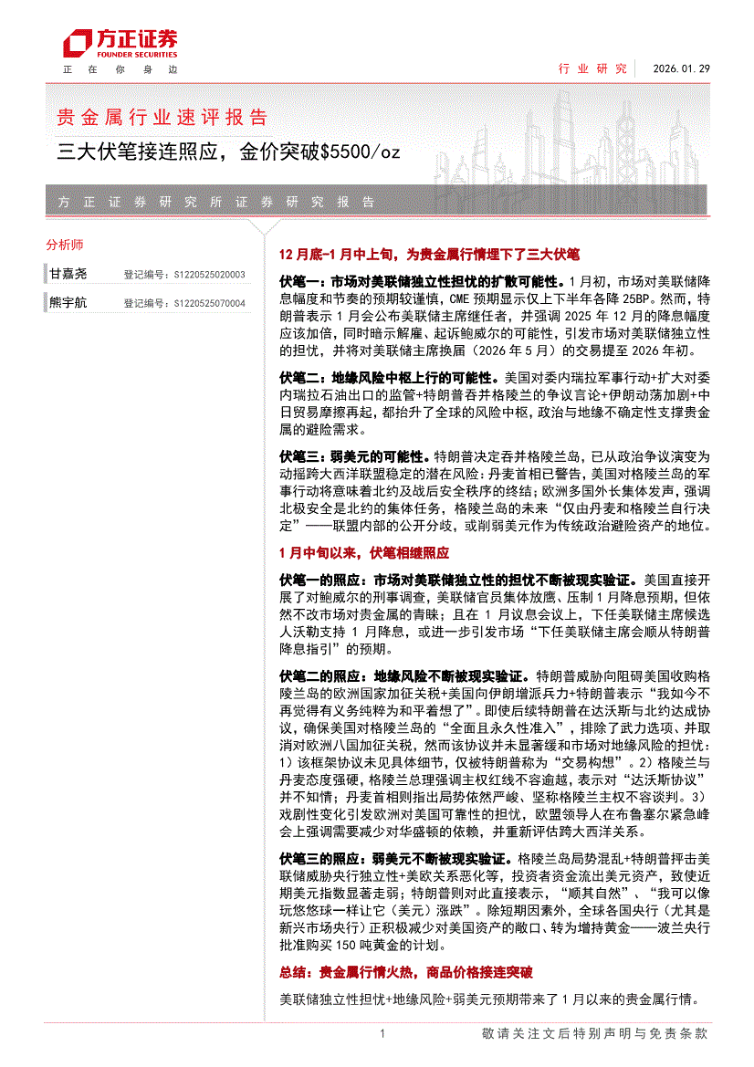 贵金属行业:方正证券-贵金属行业速评报告:三大伏笔接连照应,金价突破$5500/oz-260129
