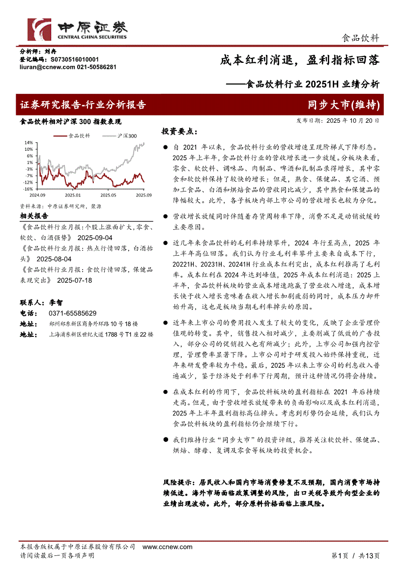 食品饮料行业:中原证券-食品饮料行业20251H业绩分析:成本红利消退,盈利指标回落-251020