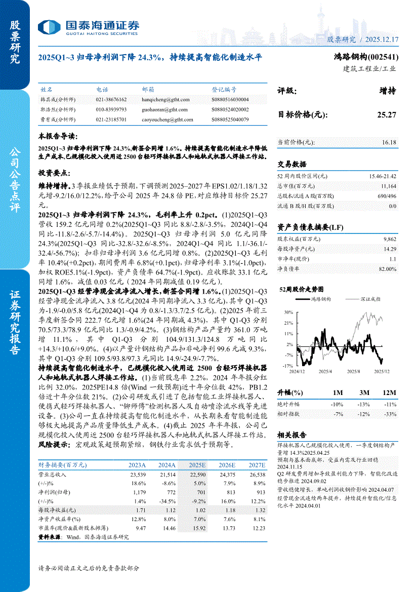 鸿路钢构:国泰海通证券-鸿路钢构-002541-2025Q1~3归母净利润下降24.3%,持续提高智能化制造水平-251217