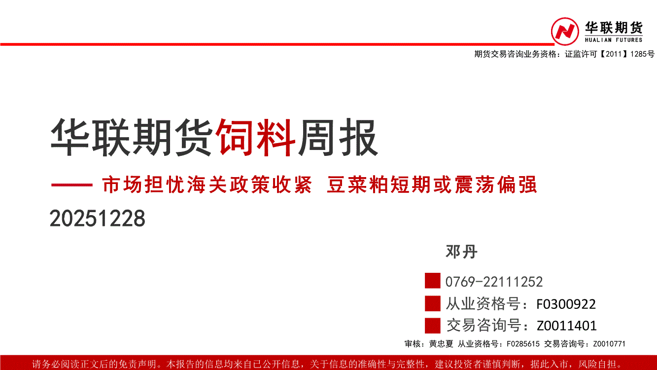 华联期货-饲料周报:市场担忧海关政策收紧,豆菜粕短期或震荡偏强-251228