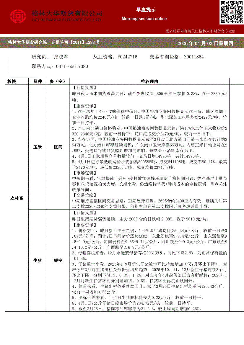 格林大华期货-早盘提示:玉米生猪鸡蛋-260402