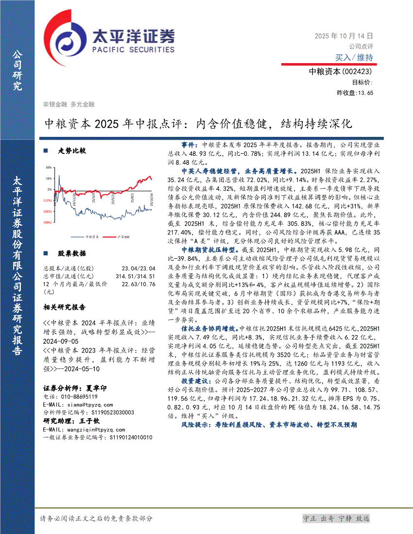 中粮资本:太平洋证券-中粮资本-002423-2025年中报点评:内含价值稳健,结构持续深化-251014