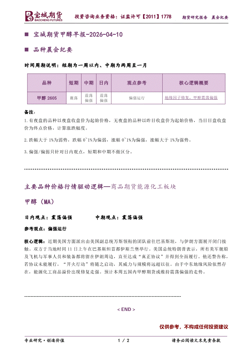 宝城期货-甲醇早报-260410