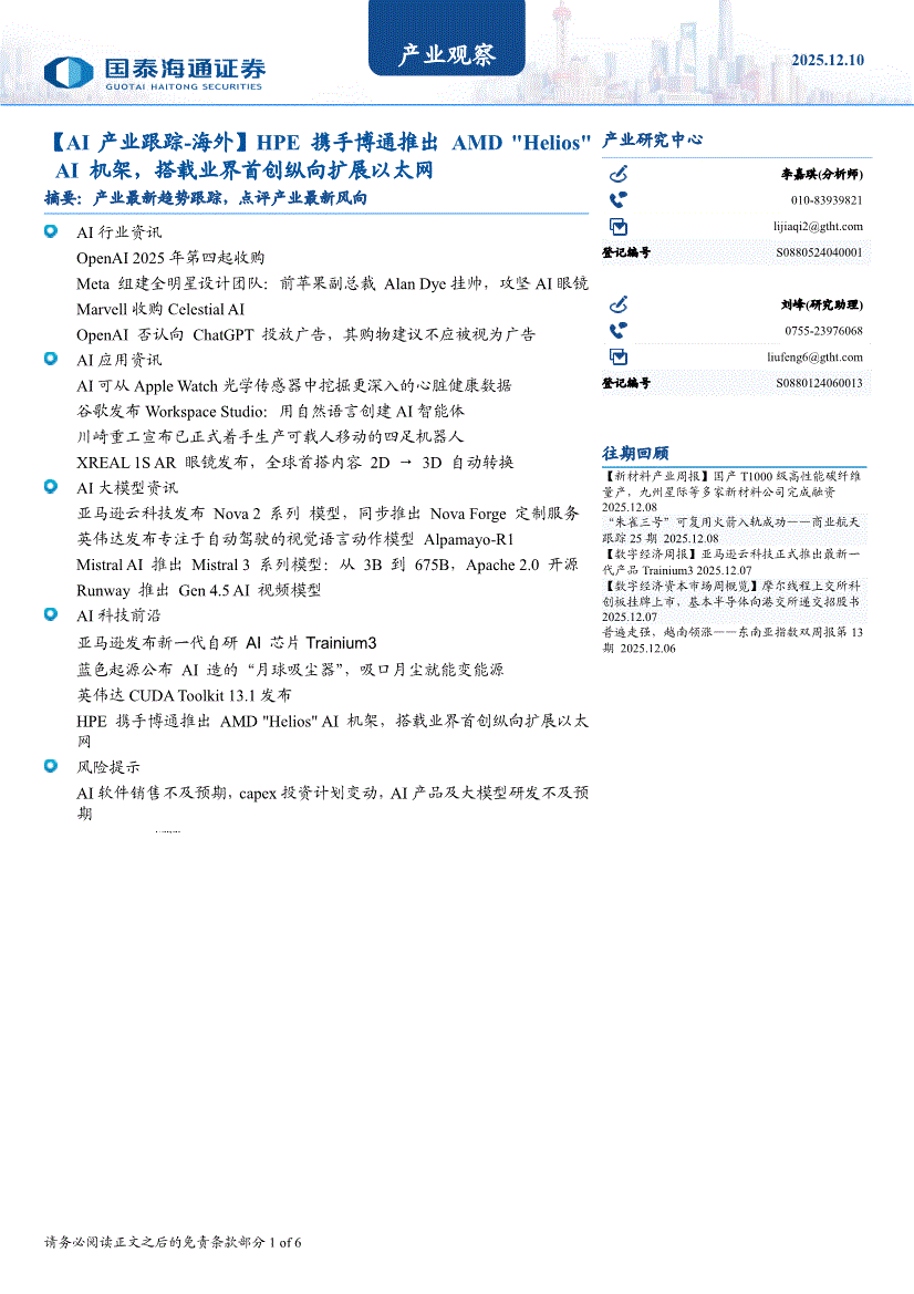 国泰海通证券-产业观察:【AI产业跟踪~海外】HPE携手博通推出AMD "Helios"AI机架,搭载业界首创纵向扩展以太网-251210