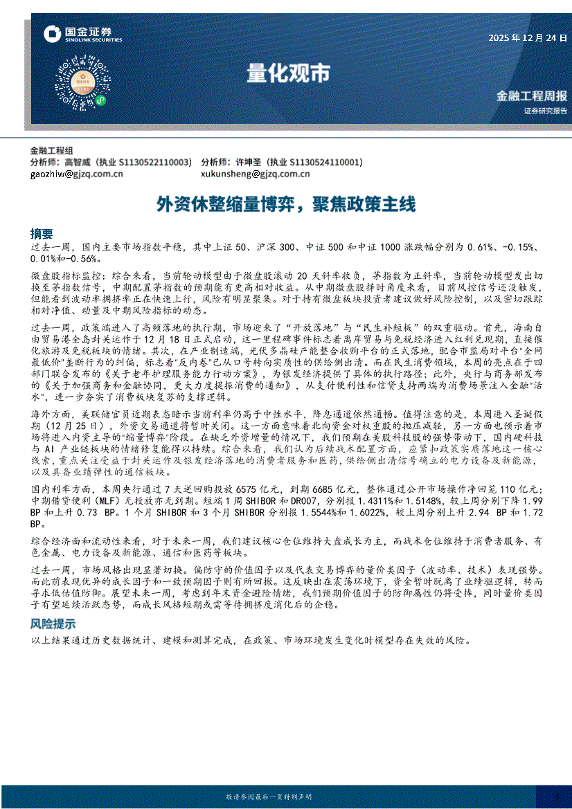 国金证券-量化观市:外资休整缩量博弈,聚焦政策主线-251224