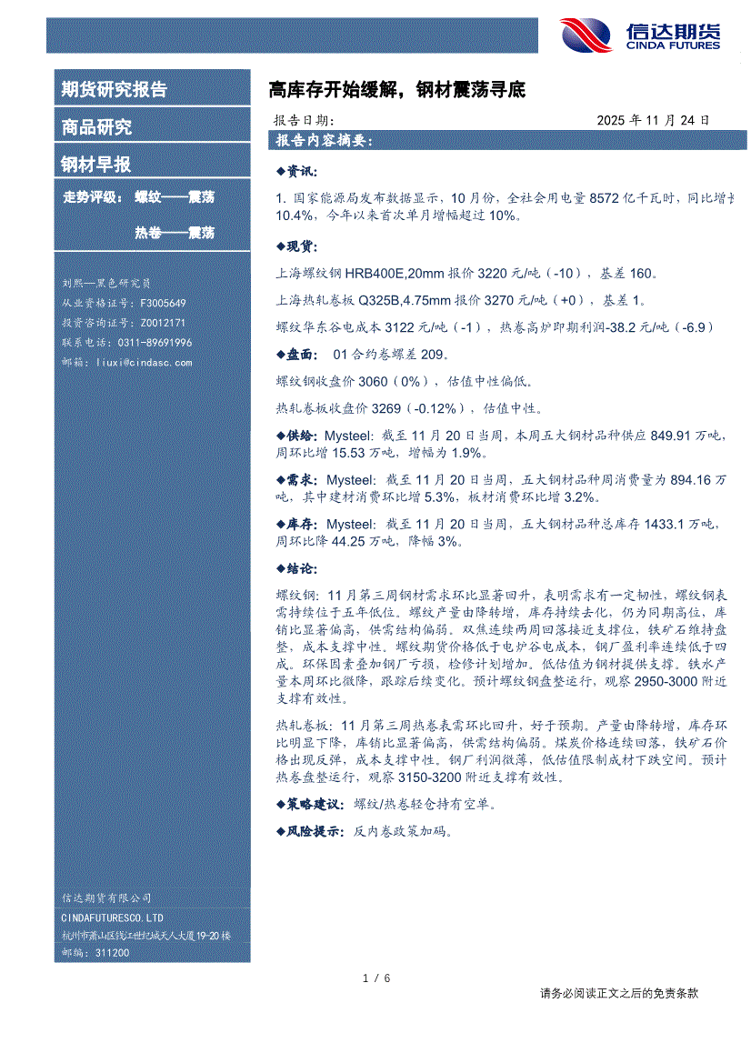 信达期货-钢材早报:高库存开始缓解,钢材震荡寻底-251125
