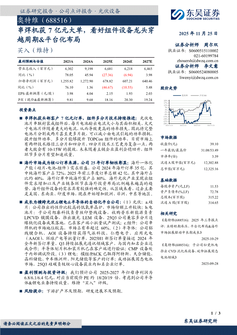 奥特维:东吴证券-奥特维-688516-串焊机获7亿元大单,看好组件设备龙头穿越周期&平台化布局-251125