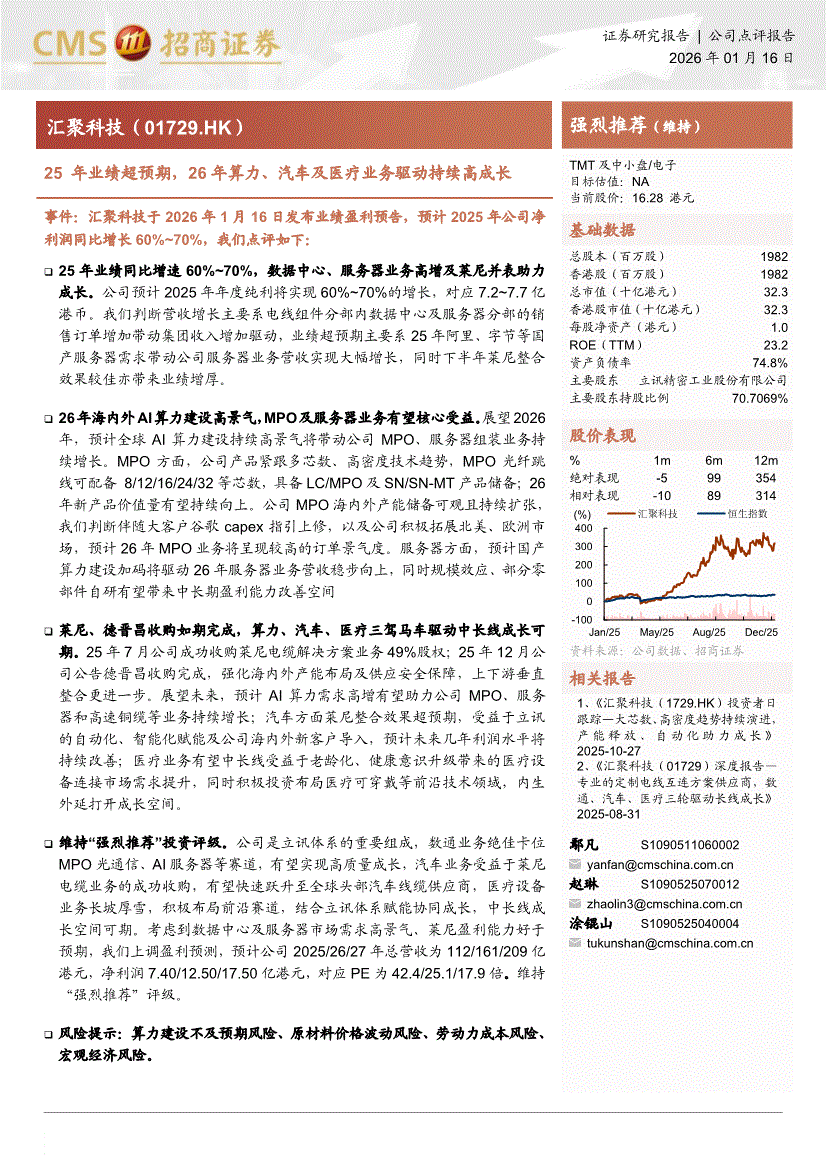 汇聚科技:招商证券-汇聚科技-1729.HK-25年业绩超预期,26年算力、汽车及医疗业务驱动持续高成长-260116