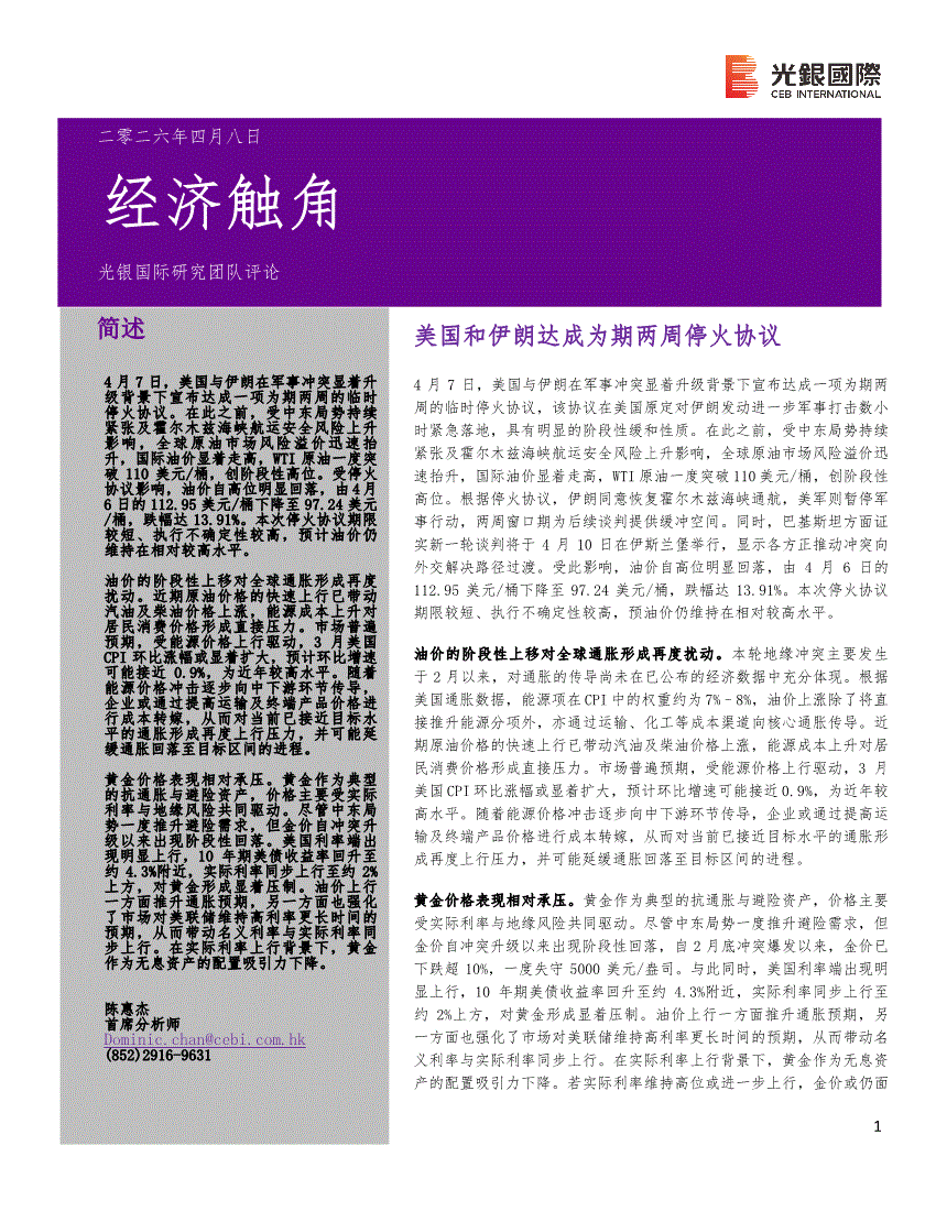光银国际-经济触角:美国和伊朗达成为期两周停火协议-260408