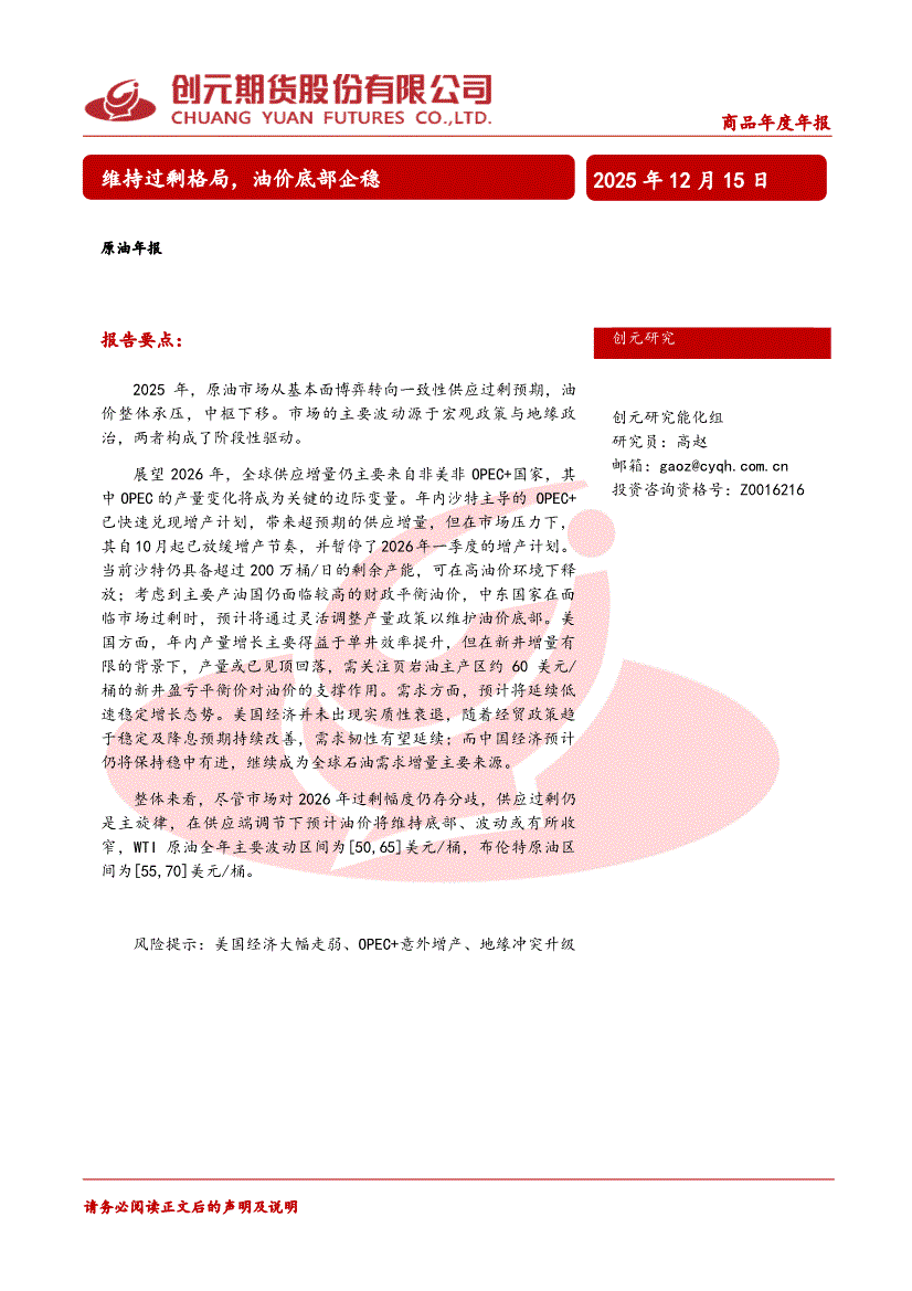 创元期货-原油年报:维持过剩格局,油价底部企稳-251215