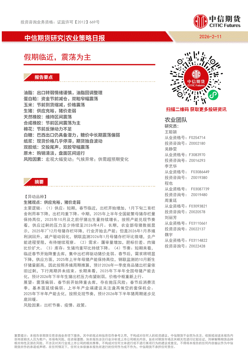 中信期货-农业策略日报:春节临近,板块品种多震荡-260210
