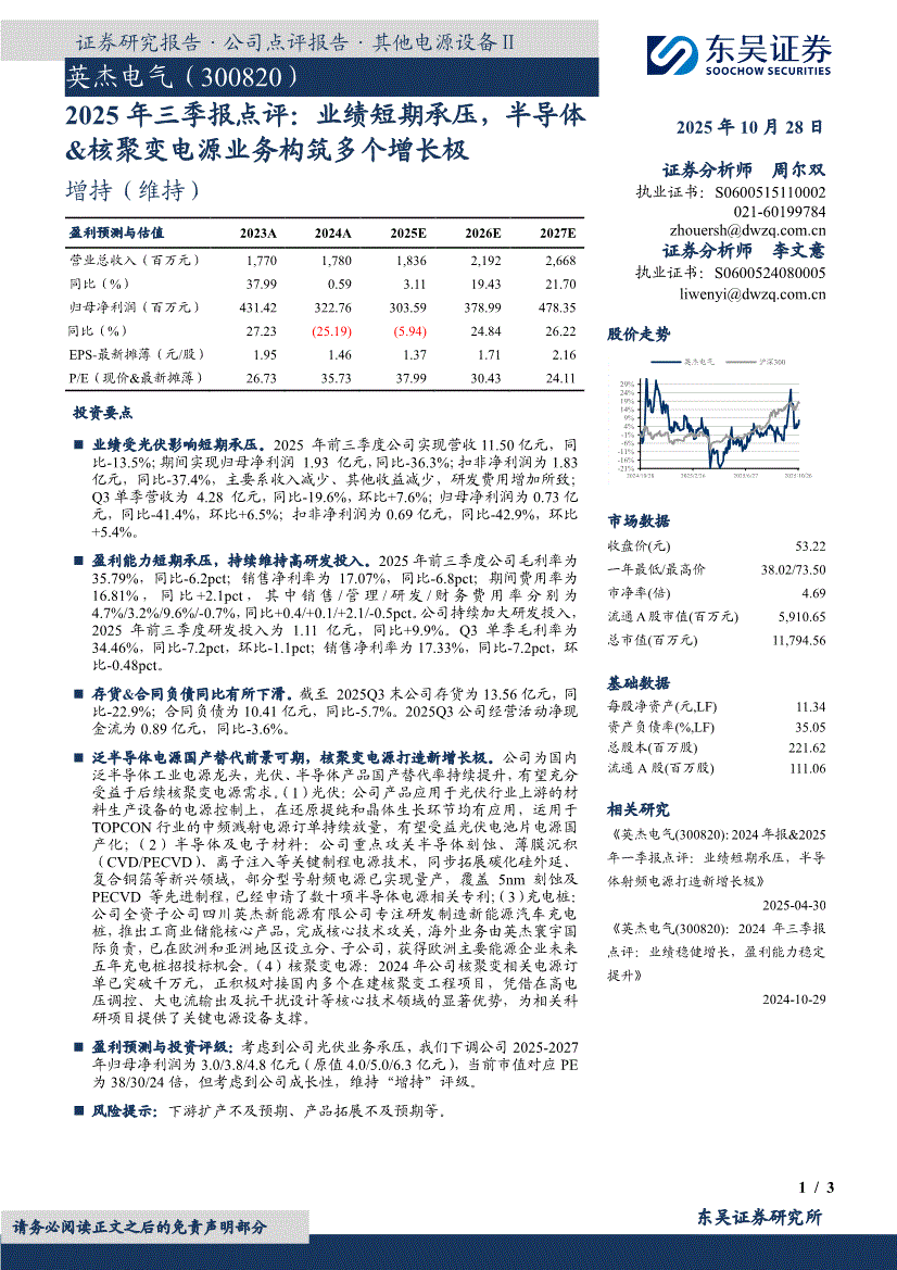 英杰电气:东吴证券-英杰电气-300820-2025年三季报点评:业绩短期承压,半导体&核聚变电源业务构筑多个增长极-251028