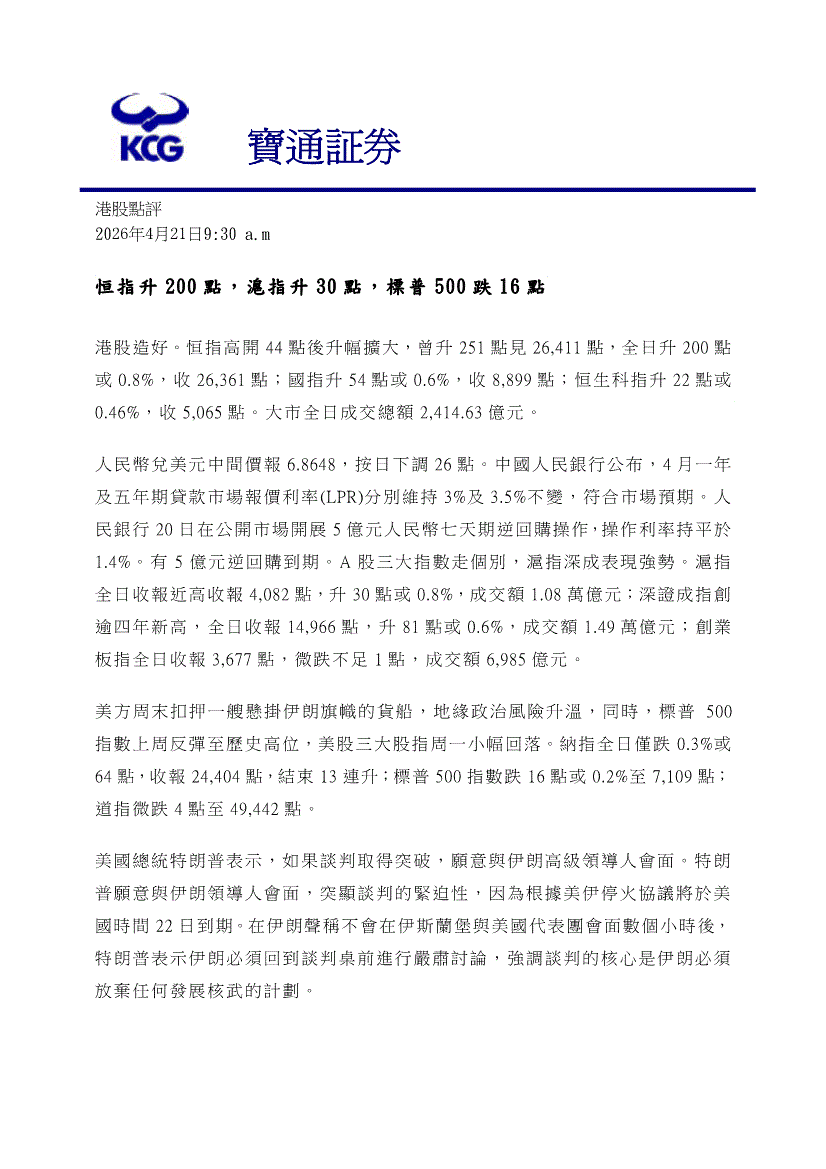 宝通证券-港股点评:恒指升200点,沪指升30点,标普500跌16点-260421