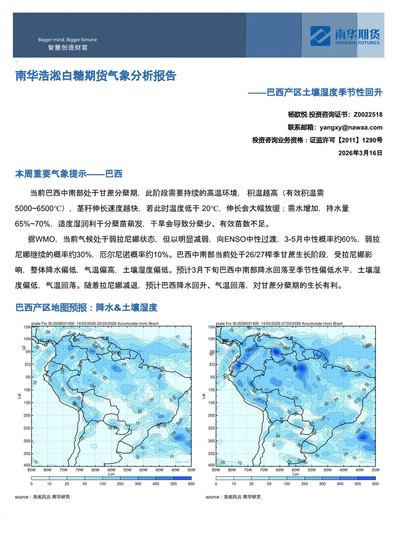 南华期货-浩淞白糖期货气象分析报告:3月上旬巴西中南部产区气温偏低-260302