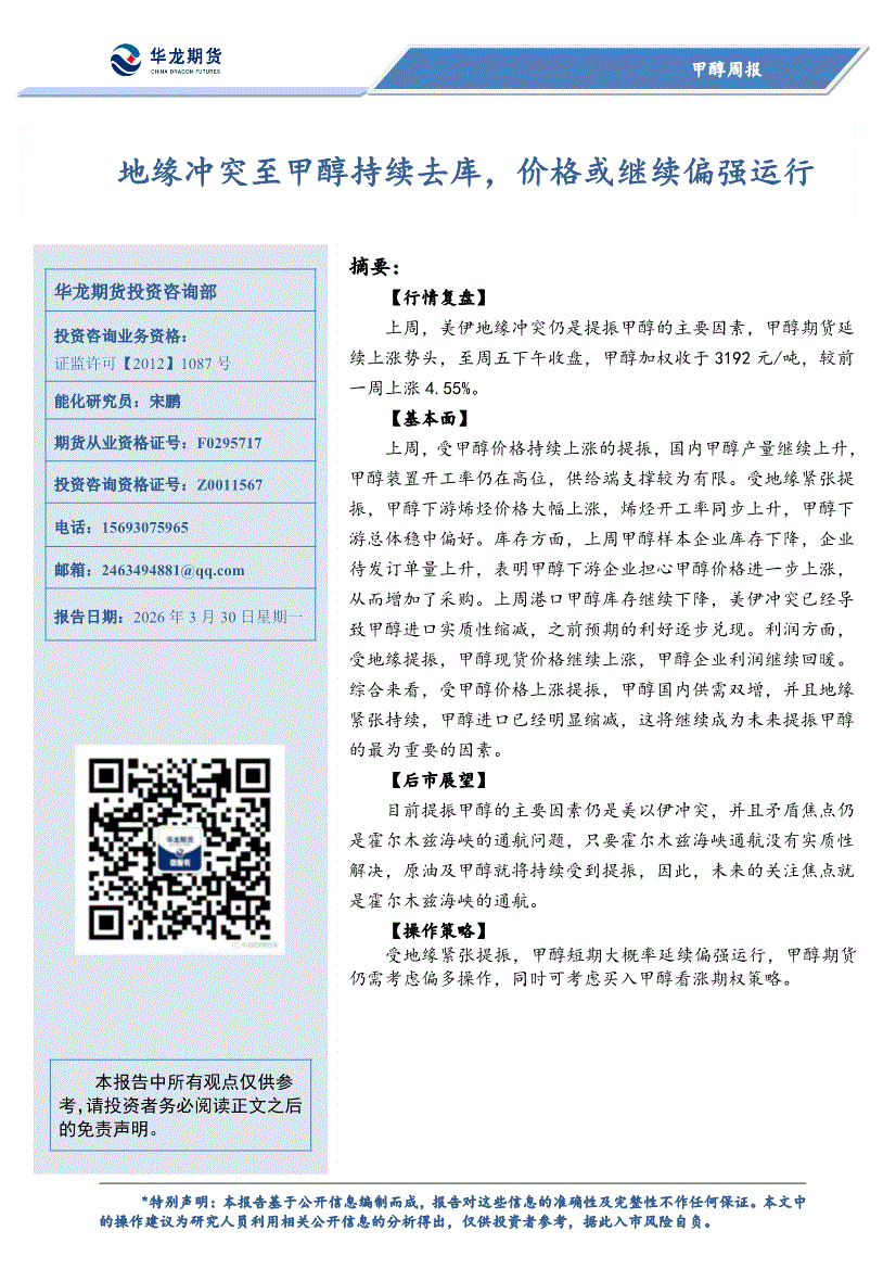 华龙期货-甲醇周报:地缘冲突至甲醇持续去库,价格或继续偏强运行-260330