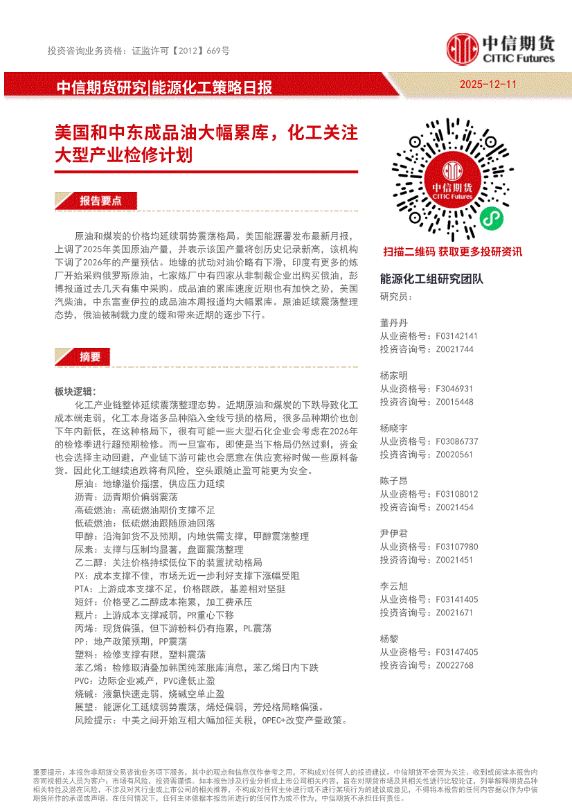 中信期货-能源化工策略日报:美国和中东成品油大幅累库,化工关注大型产业检修计划-251211