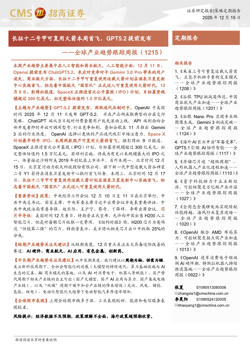 招商证券-全球产业趋势跟踪周报:长征十二号甲可复用火箭本周首飞,GPT5.2提前发布-251215