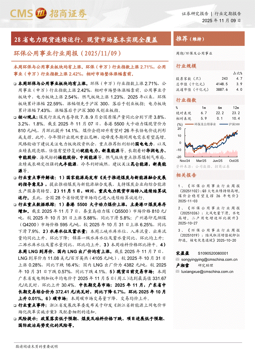 环保公用事业行业:招商证券-环保公用事业行业周报:28省电力现货连续运行,现货市场基本实现全覆盖-251109