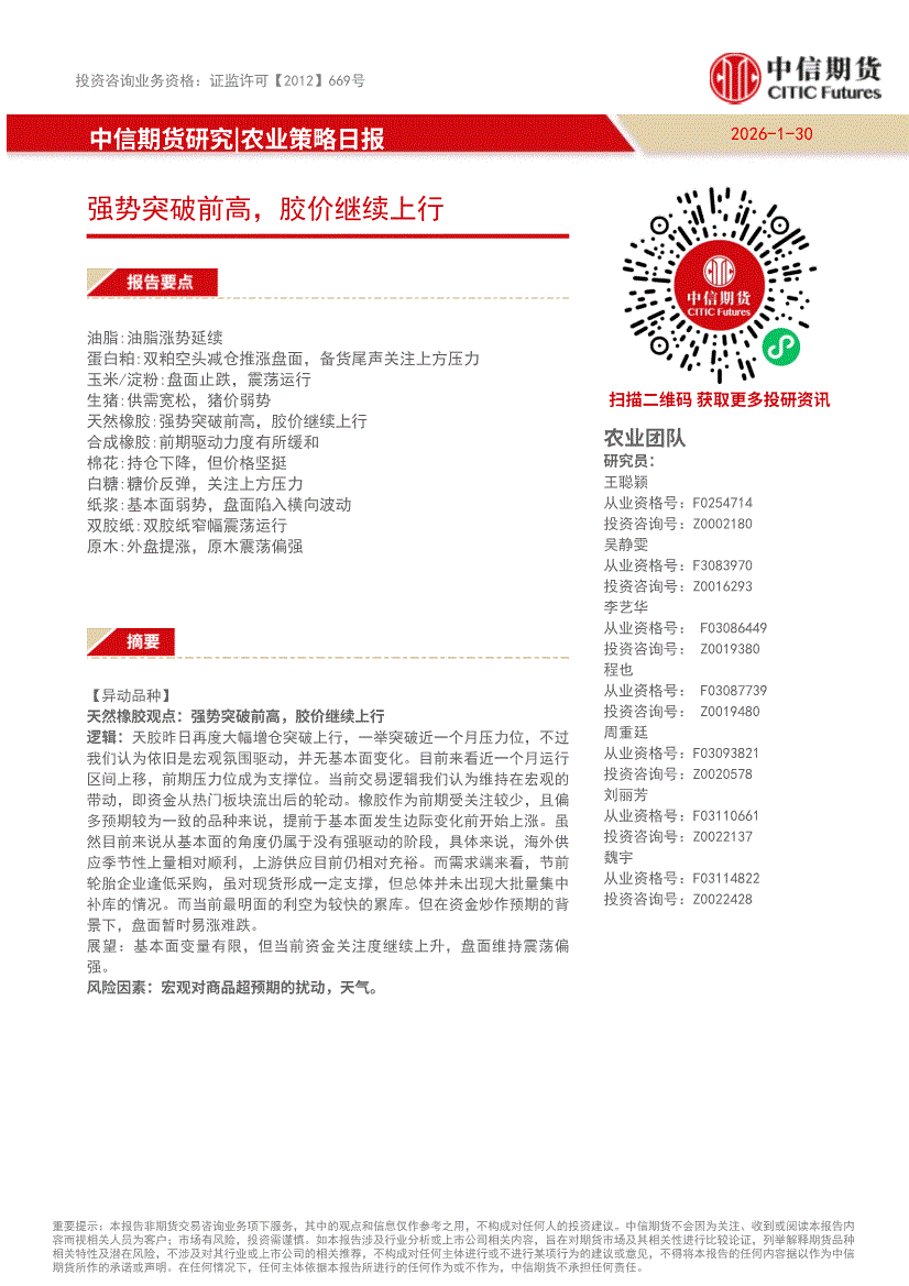 中信期货-农业策略日报:多因素共振,橡胶盘面大幅上行-260123