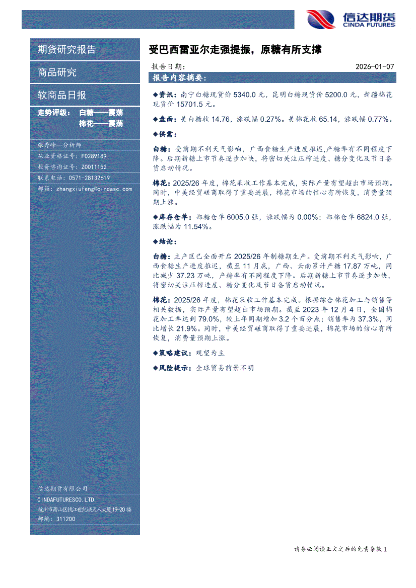 信达期货-软商品日报:受巴西雷亚尔走强提振,原糖有所支撑-260107