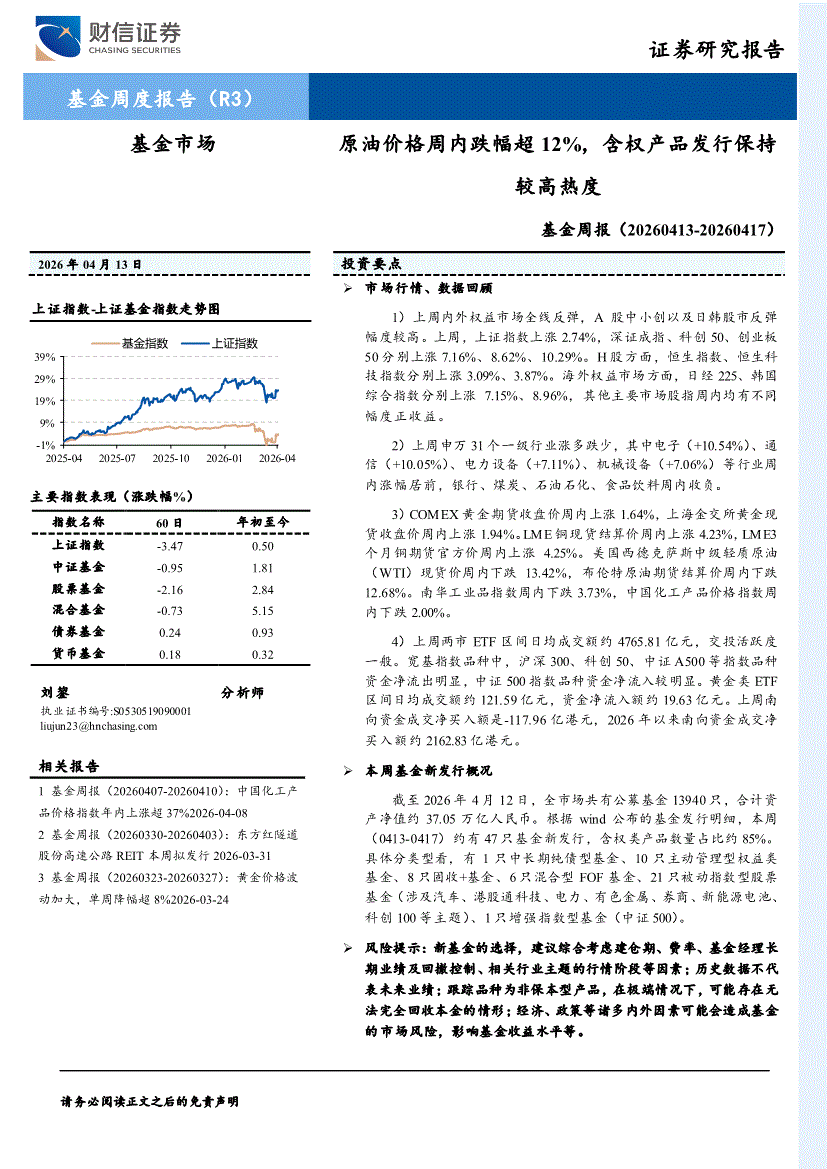 财信证券-基金周报:原油价格周内跌幅超12%,含权产品发行保持较高热度-260413