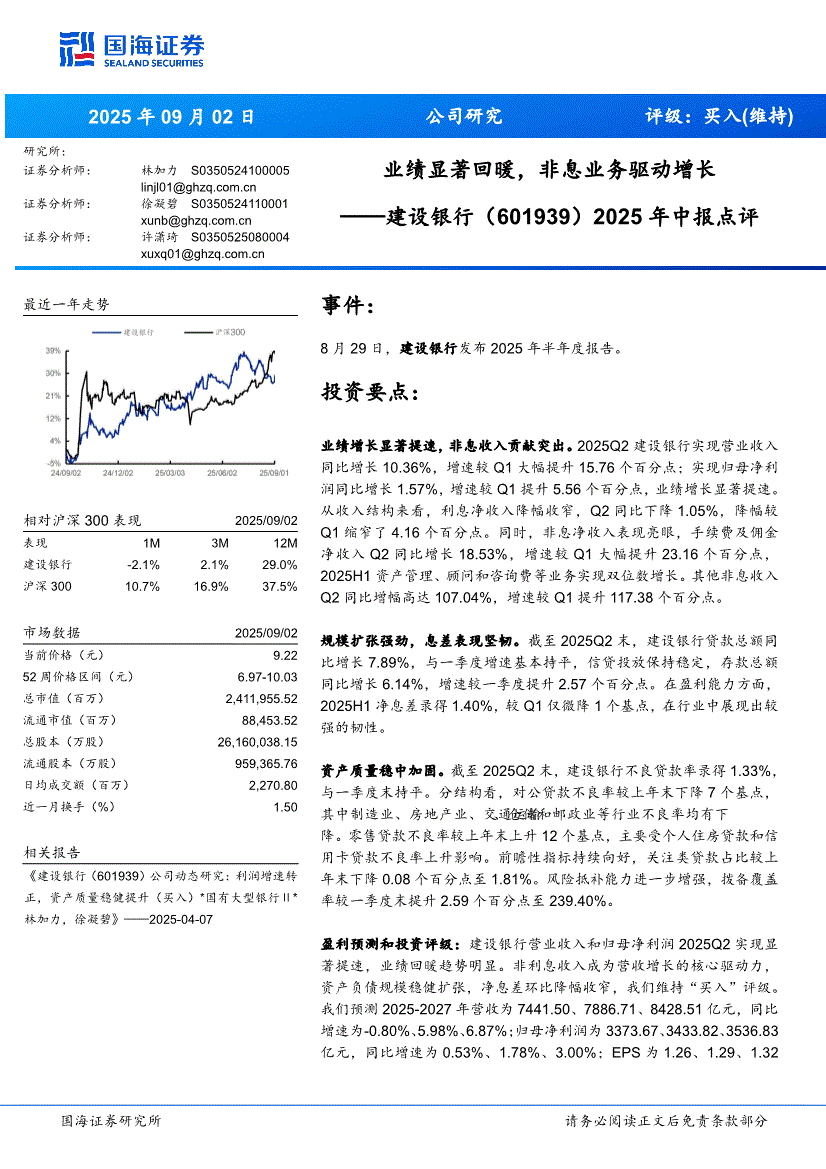 建设银行:国海证券-建设银行-601939-2025年中报点评:业绩显著回暖,非息业务驱动增长-250902