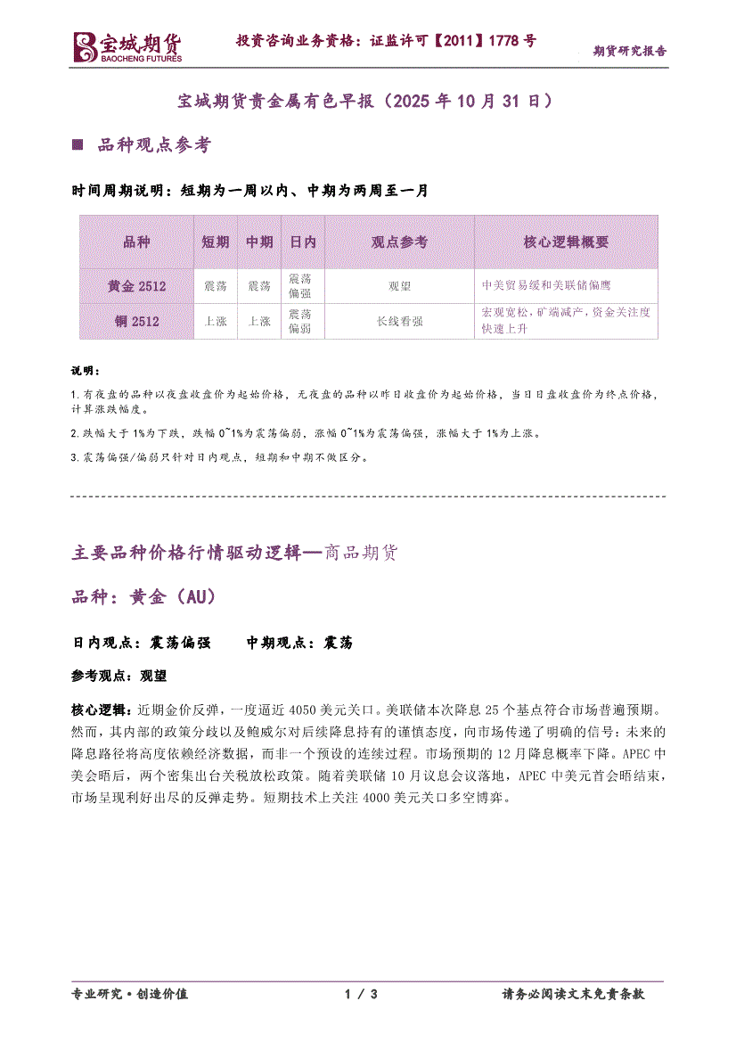 宝城期货-贵金属有色早报-251031