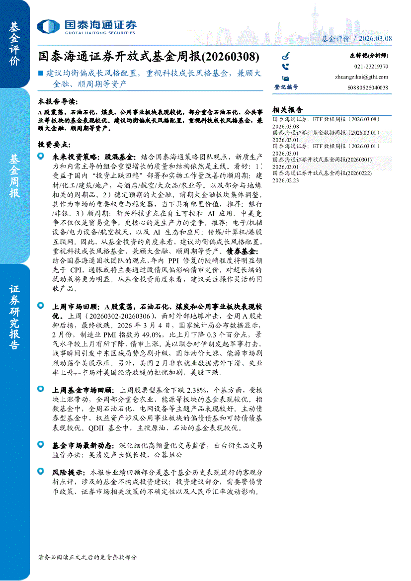 国泰海通证券-开放式基金周报:建议均衡偏成长风格配置,重视科技成长风格基金,兼顾大金融、顺周期等资产-260308