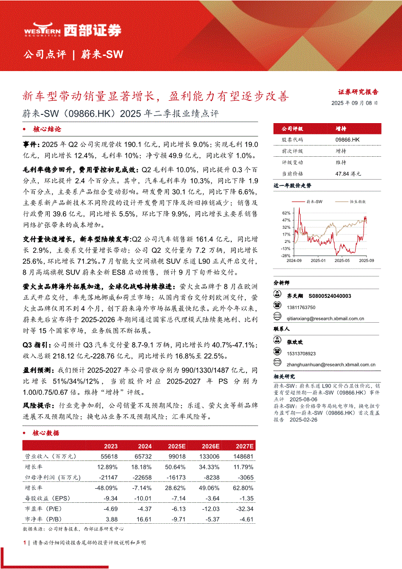 蔚来~SW:西部证券-蔚来~SW-9866.HK-2025年二季报业绩点评:新车型带动销量显著增长,盈利能力有望逐步改善-250908