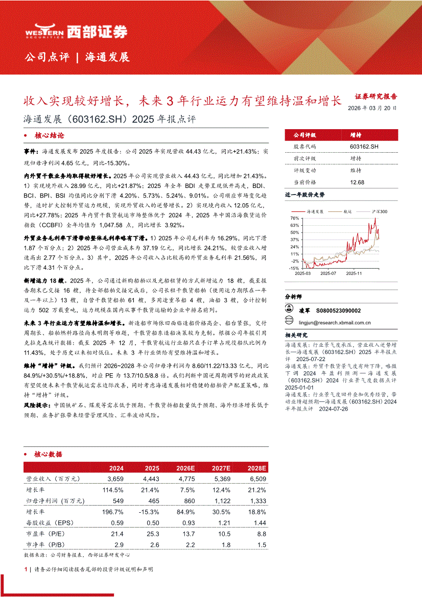 海通发展:西部证券-海通发展-603162-2025年报点评:收入实现较好增长,未来3年行业运力有望维持温和增长-260320