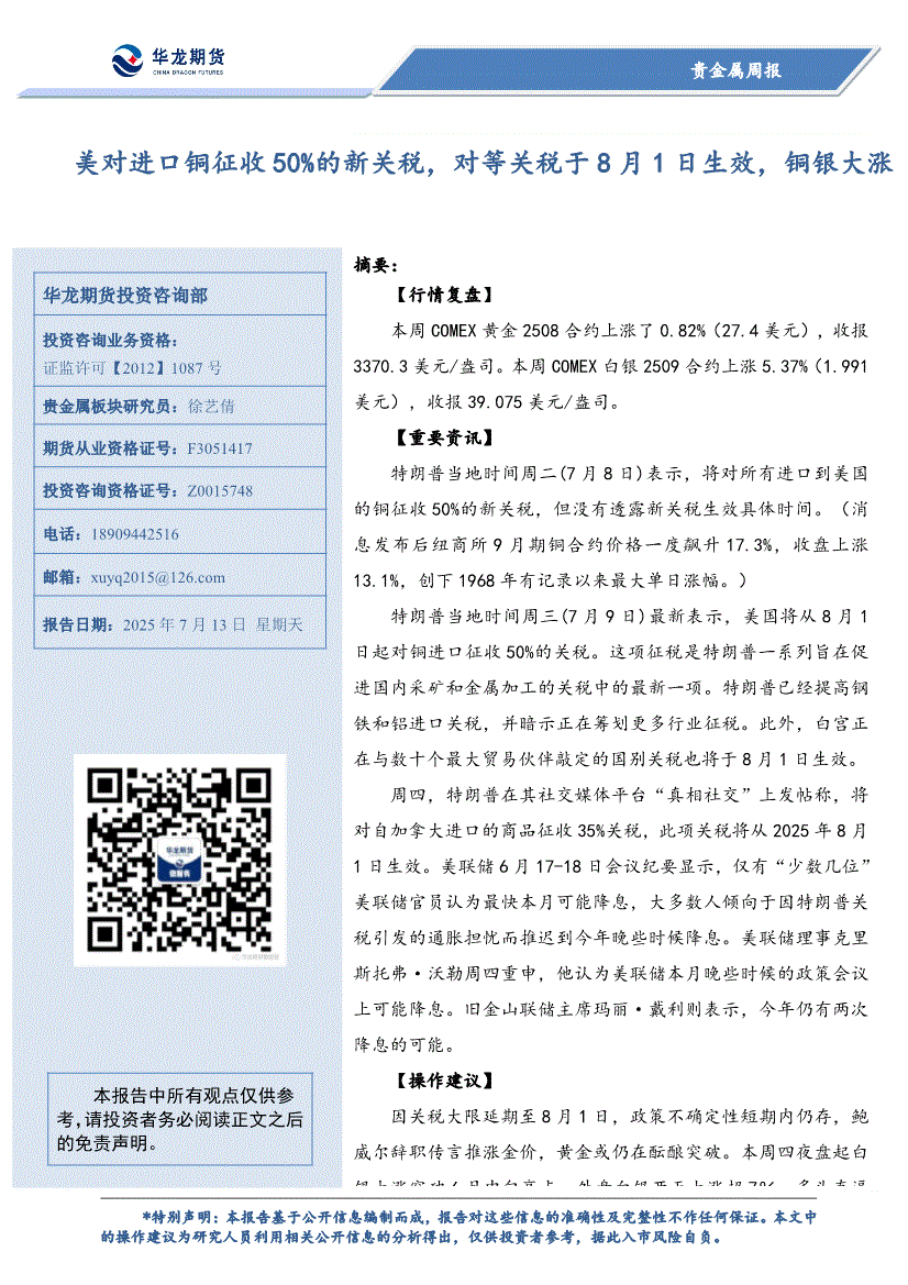 华龙期货-贵金属周报:美对进口铜征收50%的新关税,对等关税于8月1日生效,铜银大涨-250713