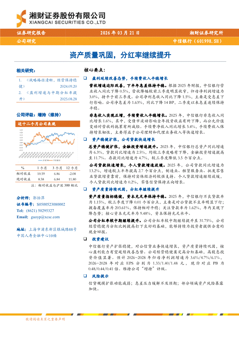 中信银行:湘财证券-中信银行-601998-资产质量巩固,分红率继续提升-260321