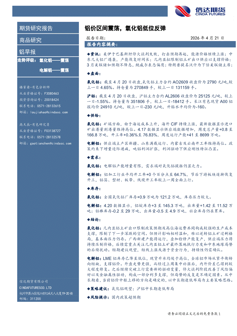 信达期货-铝早报:铝价区间震荡,氧化铝低位反弹-260421