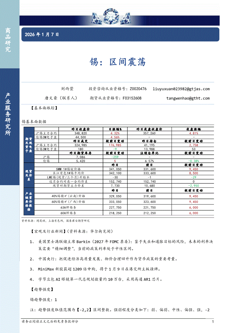 国泰君安期货-锡:区间震荡-260107
