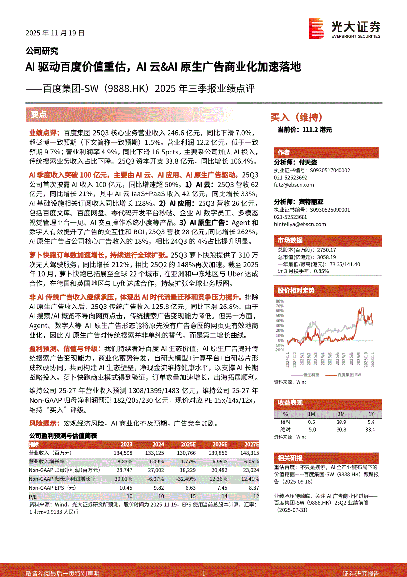 百度集团~SW:光大证券-百度集团~SW-9888.HK-2025年三季报业绩点评:AI驱动百度价值重估,AI云&AI原生广告商业化加速落地-251119