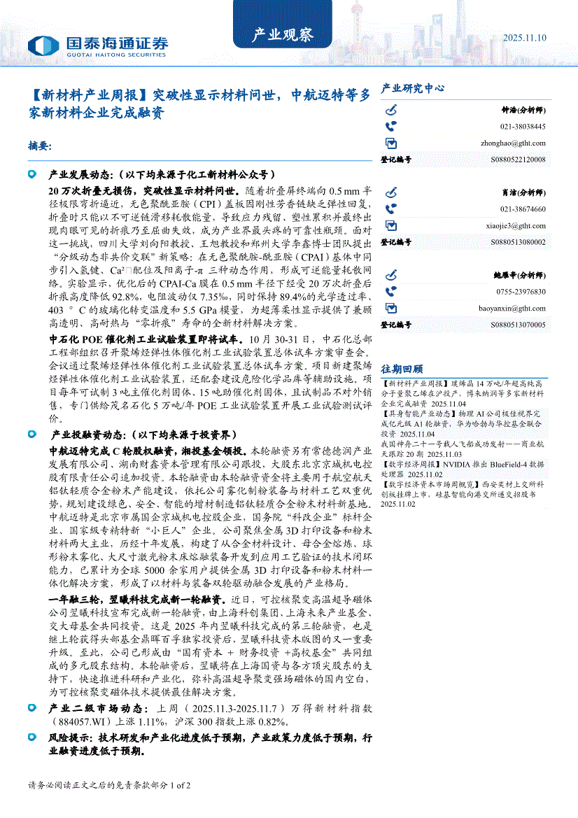 国泰海通证券-产业观察:【新材料产业周报】突破性显示材料问世,中航迈特等多家新材料企业完成融资-251110