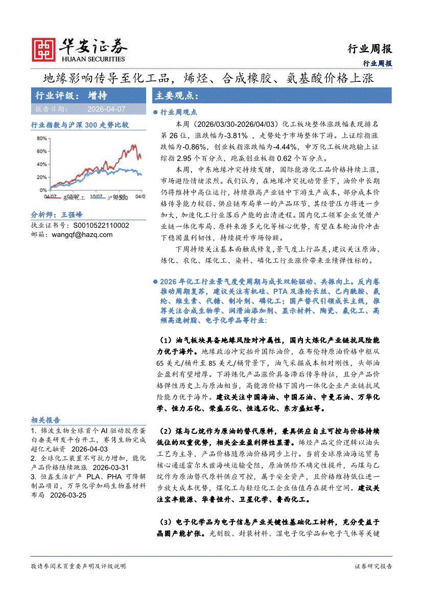 化工行业:华安证券-化工行业周报:地缘影响传导至化工品,烯烃、合成橡胶、氨基酸价格上涨-260407