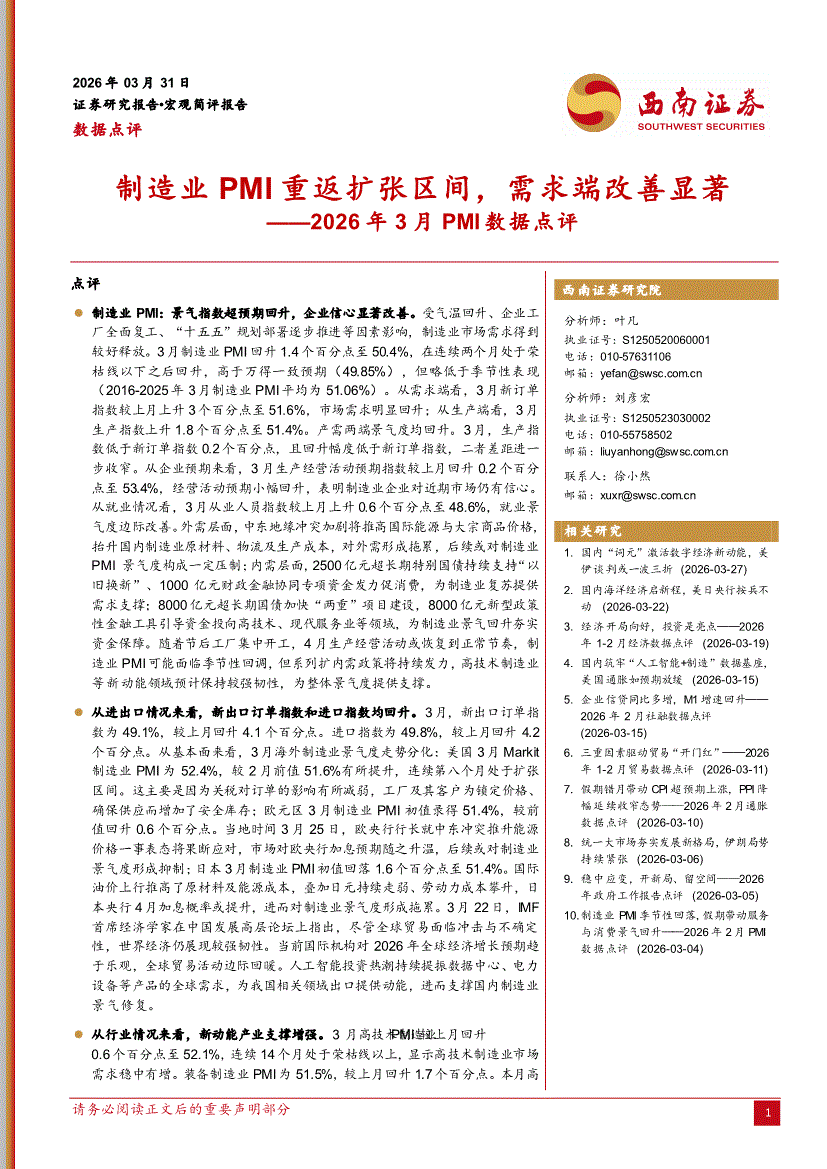 西南证券-2026年3月PMI数据点评:制造业PMI重返扩张区间,需求端改善显著-260331