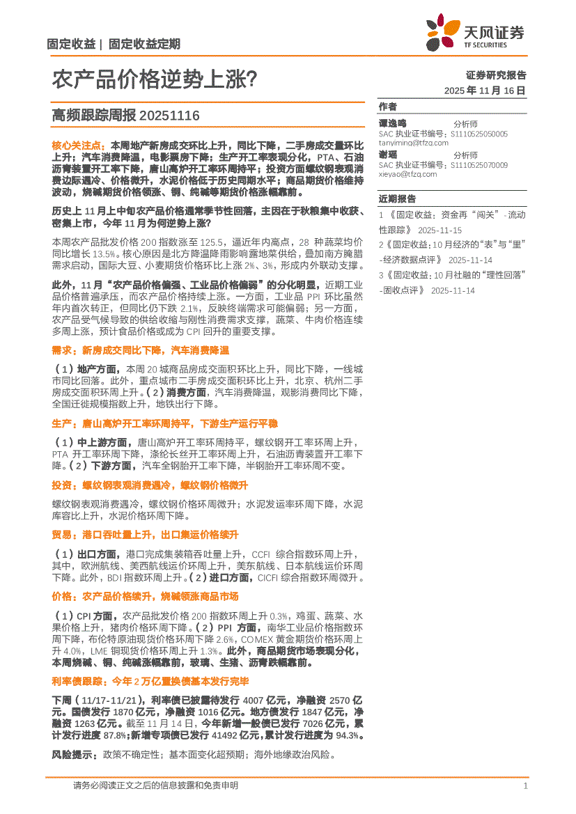 天风证券-高频跟踪周报:农产品价格逆势上涨?-251116