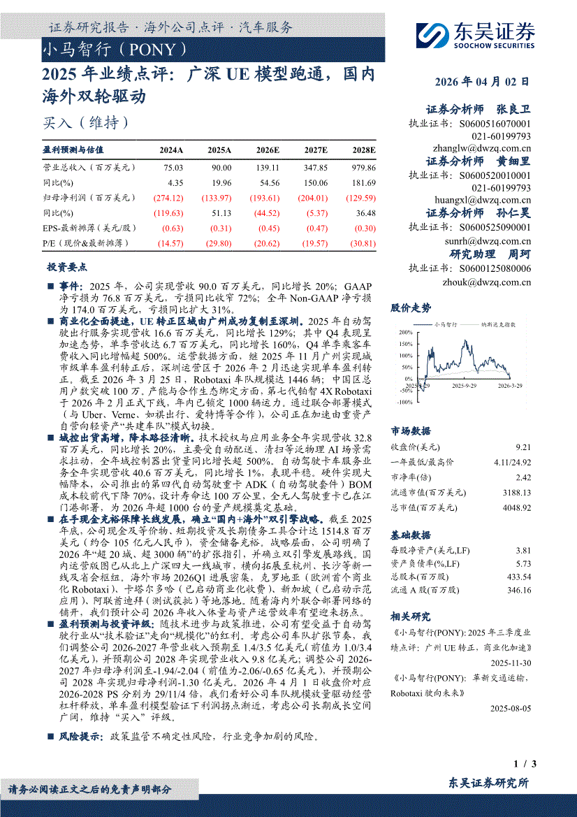 小马智行:东吴证券-小马智行-PONY.US-2025年业绩点评:广深UE模型跑通,国内海外双轮驱动-260402