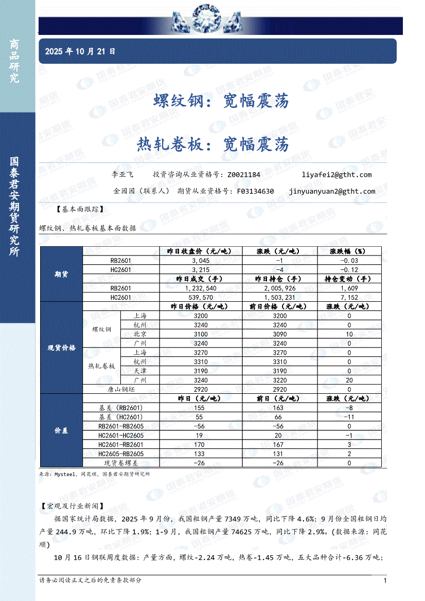 国泰君安期货-螺纹钢:宽幅震荡,热轧卷板,宽幅震荡-251021